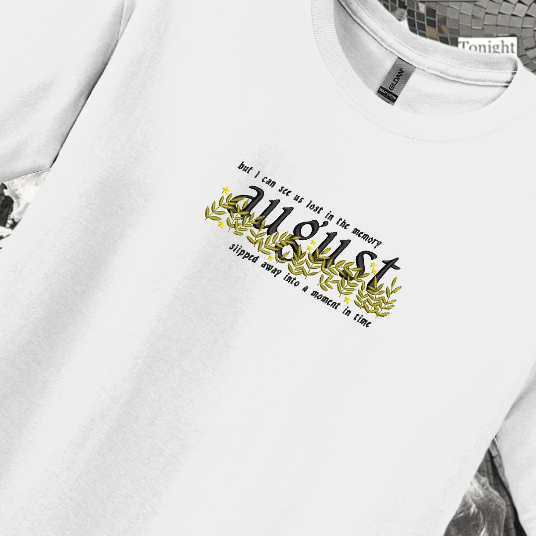 Tricou Alb Brodat August Slipped Away Like A Moment In Time Folklore Taylor Swift, perfect pentru fanii TS si adeptii stilului casual.