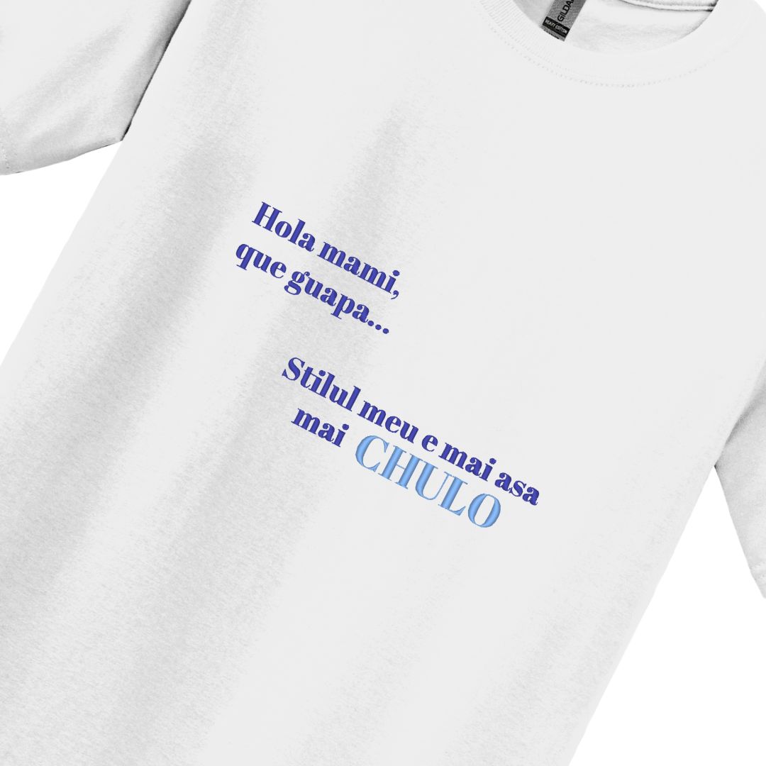 Tricou Alb cu broderie Hola Mami Que Guapa brodat in doua culori.